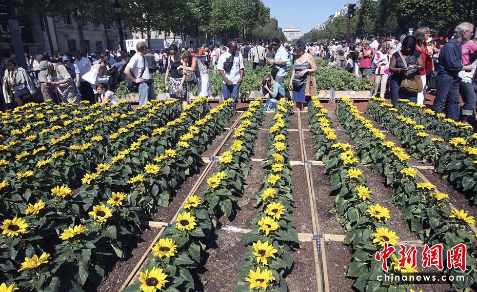 5月24日,法國總統薩科齊和妻子布呂尼參觀在法國巴黎舉行的“自然首都”展。該項展覽是由街頭藝術家加德·魏爾聯手法國“青年農民協會”和林業協會共同發起的的,將百余種農作物、樹木和動物“齊聚”法國首都巴黎的香榭麗舍大街,令這條“香街”變身“綠色的自然世界”。圖片來源:中國新聞網