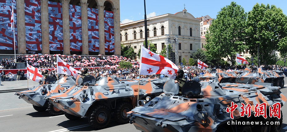 5月26日,在格魯吉亞首都第比利斯,受閱部隊從議會大廈前走過。當日,格魯吉亞在第比利斯舉行慶祝格獨立日閱兵典禮,格總統(tǒng)薩卡什維利在議會大廈前檢閱軍隊并發(fā)表演講。圖片來源:中國新聞網(wǎng)