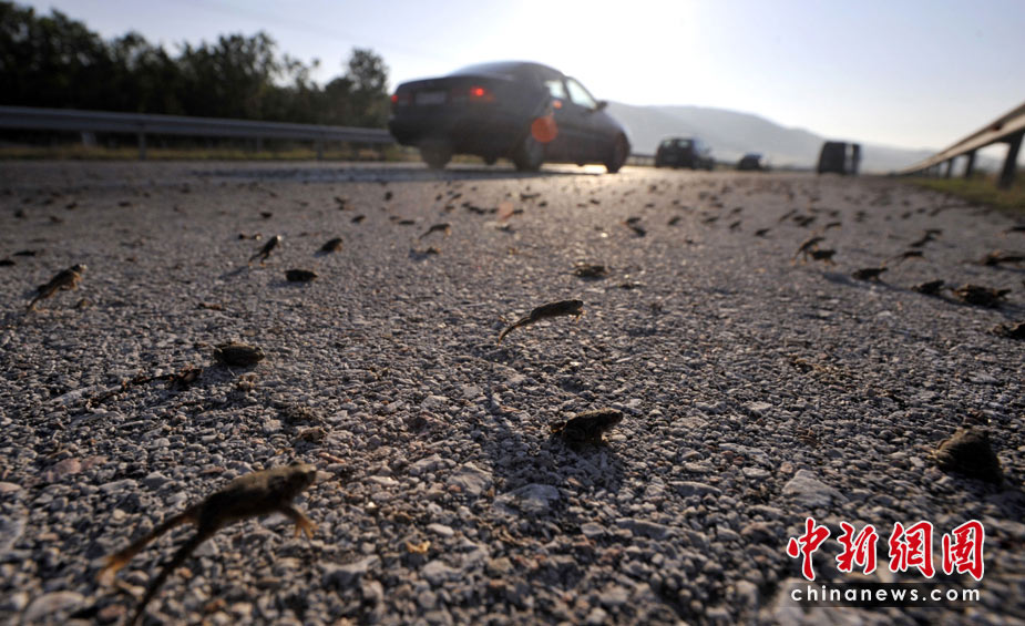 26日,希臘東北部地區(qū)的一條高速公路遭數(shù)百萬只青蛙“占據(jù)”而被迫關(guān)閉了兩個(gè)小時(shí)。圖片來源:中國新聞網(wǎng)>>點(diǎn)擊觀看詳細(xì)內(nèi)容