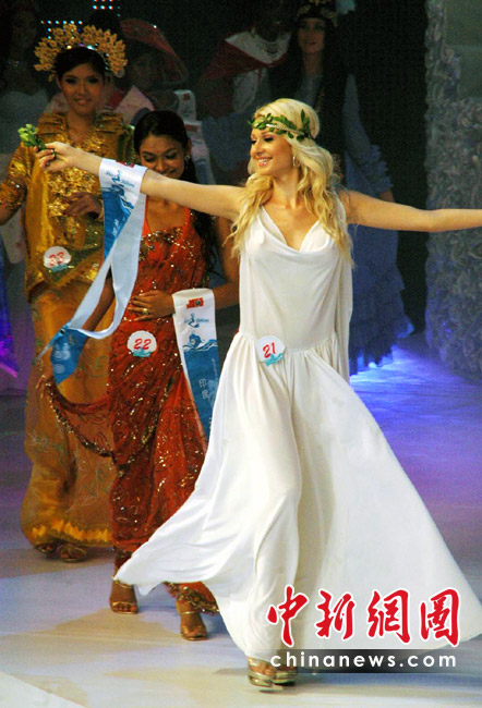 5月29日晚,第35屆國際比基尼小姐全球總決賽在三亞“美麗之冠”落下帷幕,22歲的羅馬尼亞選手Diana Irina Boanca摘得冠軍。總決賽還評選出了四季小姐,18歲的中國選手趙茜獲得“秋季小姐”,澳大利亞、委內瑞拉和拉脫維亞選手分別獲得春、夏、冬季小姐。共有來自世界各地的64位佳麗參加了總決賽的角逐。當晚,佳麗們展示了各自國家或地區特色的民族服飾,用不同的方式展示了不同風格的比基尼“秀”,性感迷人。 中新社記者 尹海明攝