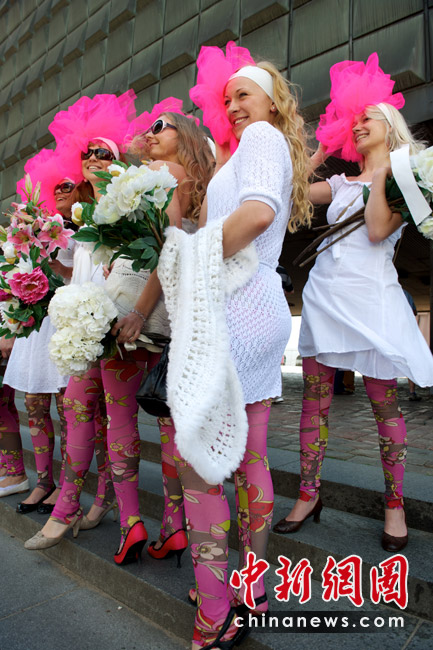 5月29日,在拉脫維亞首都里加,眾多金發(fā)美女身著艷麗裝扮在街頭游行,大秀嫵媚身材。
