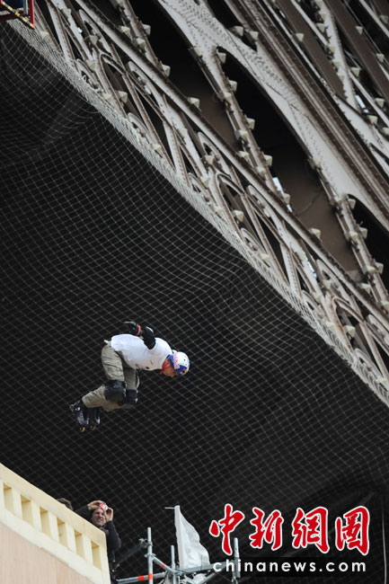 5月29日,法國巴黎,法國極限直排輪冠軍克里斯(Taig Khris)從法國艾菲爾鐵塔跳下,創下世界新自由落體紀錄。
