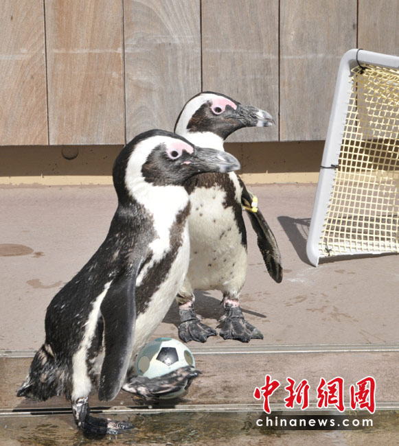 6月1日,在日本東京一家海洋館里,幾只企鵝“披掛上陣”,進(jìn)行了一場別開生面的足球賽,迎接世界杯。
