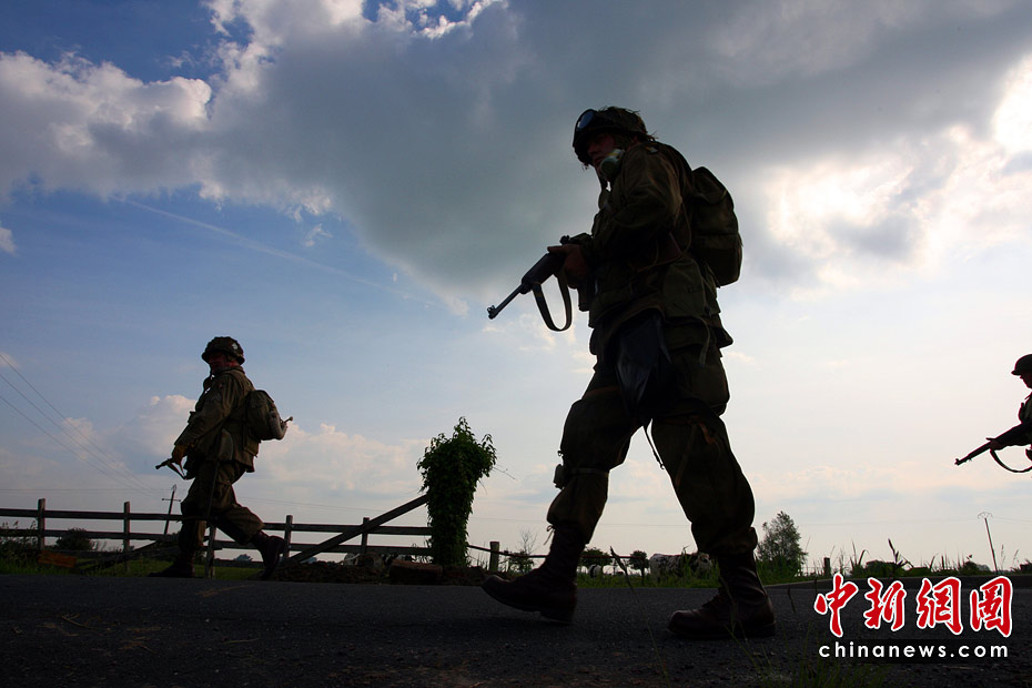 6月5日,諾曼底登陸66周年前夕,一批演員身著二戰時期美軍軍服,在法國諾曼底卡倫坦重現了這次著名的戰役。