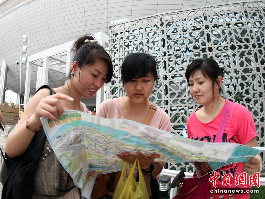 截至6月5日19點30分,上海世博會累計參觀者已超過1000萬人次。據悉,上海世博會的規劃用地為5.28平方公里,約242個國家和國際組織參展分布在浦東和浦西兩大區域。要想在這么大的地方找到自己想去的地方,那么世博地圖就是必須的裝備。圖為上海世博園內游客正在地圖上尋找自己要去的地方。中新社記者 杜洋 攝