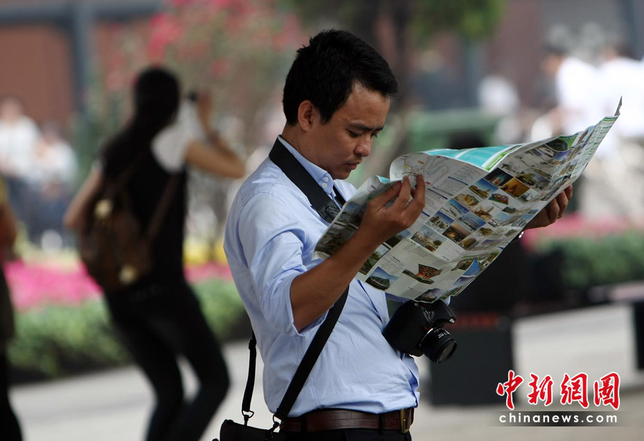 截至6月5日19點30分,上海世博會累計參觀者已超過1000萬人次。據悉,上海世博會的規劃用地為5.28平方公里,約242個國家和國際組織參展分布在浦東和浦西兩大區域。要想在這么大的地方找到自己想去的地方,那么世博地圖就是必須的裝備。圖為上海世博園內游客正在地圖上尋找自己要去的地方。中新社記者 杜洋 攝