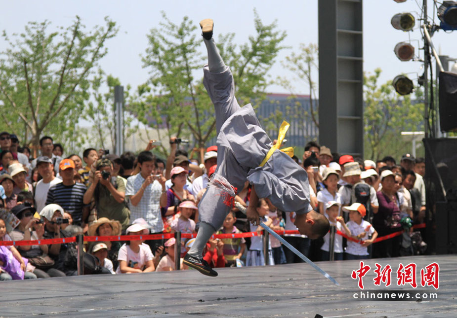 自5月1日開始,上海世博園D片區綜藝廣場每天都有少林寺功夫展演,受到世博參觀者的熱捧。中新社記者 殷春永攝