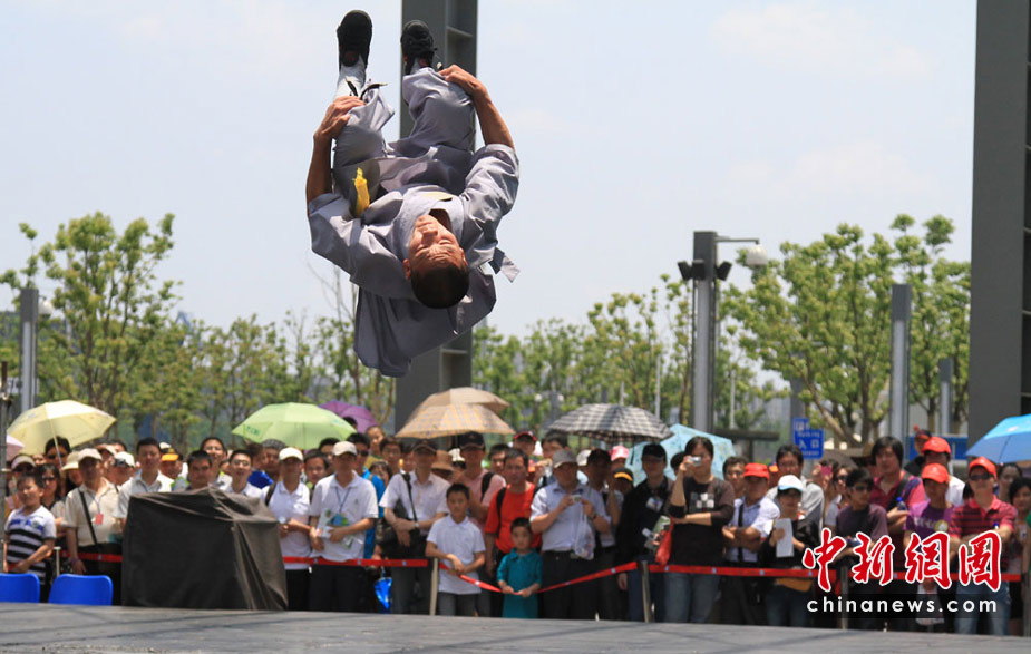 自5月1日開始,上海世博園D片區綜藝廣場每天都有少林寺功夫展演,受到世博參觀者的熱捧。中新社記者 殷春永攝