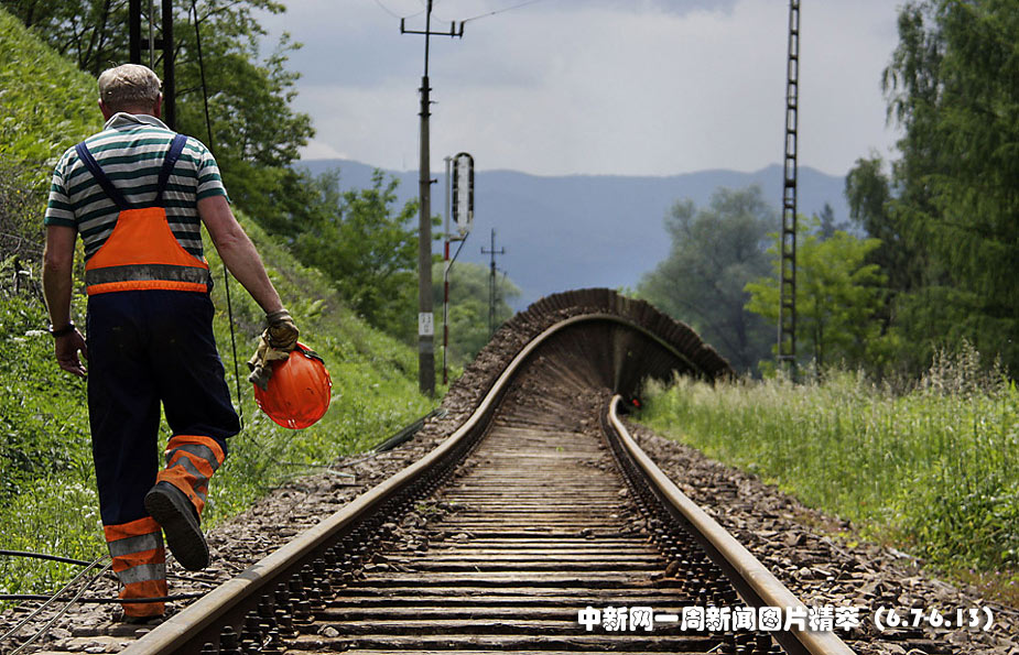 周二(8日),在波蘭Nowy Sacz附近,一名鐵路工人在扭曲的鐵道旁行走。近來的暴雨導(dǎo)致水位高漲,使軌道變形。