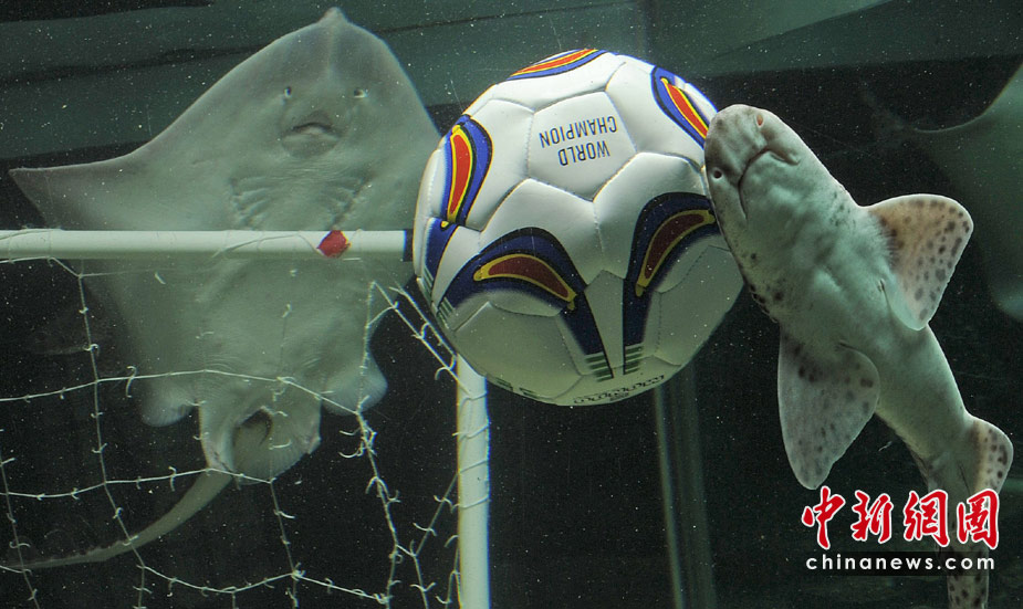 當地時間6月15日,德國北部,水族館里的海洋生物爭搶填滿飼料的足球。
