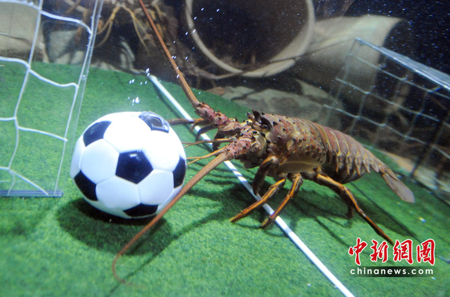 當地時間6月15日,德國北部,水族館里的海洋生物爭搶填滿飼料的足球。