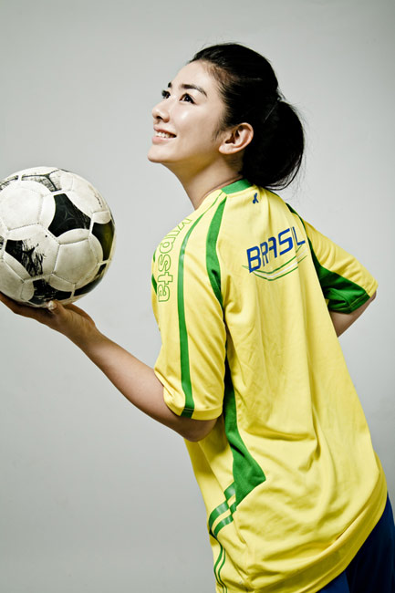 近日,黃奕身穿巴西隊球衣拍攝了一組世界杯足球寫真,為南非世界杯助威喝彩。