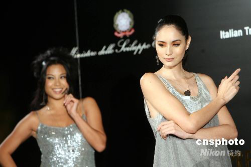 九月二十日晚,香港影視紅星廖碧兒、名模Ana R在意大利商務專員公署舉辦的酒會上展示仿巧克力珠寶首飾,演繹意大利設計師的創意。中新社發 洪少葵 攝