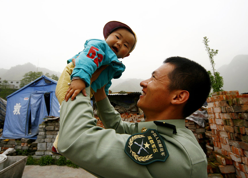 2009年4月下旬,解放軍官兵回到08年地震參加救援的重災(zāi)區(qū)什邡市鎣華鎮(zhèn)、紅白真鎮(zhèn)、洛水鎮(zhèn),看望慰問(wèn)當(dāng)?shù)厝罕姡赖煊鲭y者。 中新社發(fā) 鐘 敏 攝