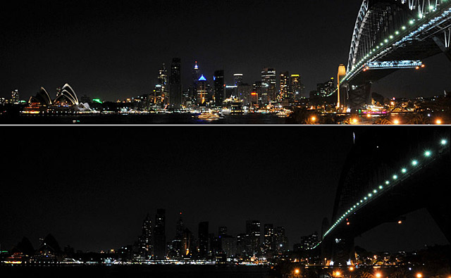 澳大利亞悉尼:3月28日拍攝的拼版照片顯示的是澳大利亞悉尼歌劇院附近建筑在參與“地球一小時(shí)”熄燈行動(dòng)前(上)和熄燈后(下)的對(duì)比情況。