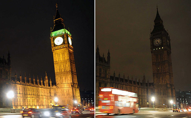 英國倫敦:3月28日,位于倫敦的英國議會大樓熄燈時(下)和重新亮燈后的對比情況。