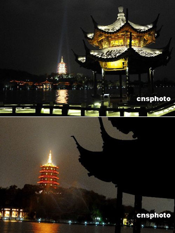 浙江杭州:3月28日晚8時30分至9時30分,西湖邊雷峰塔關閉塔身及周邊的所有景觀燈光,只留下燈色較暗的勾勒燈。中新社發 引煒 攝
