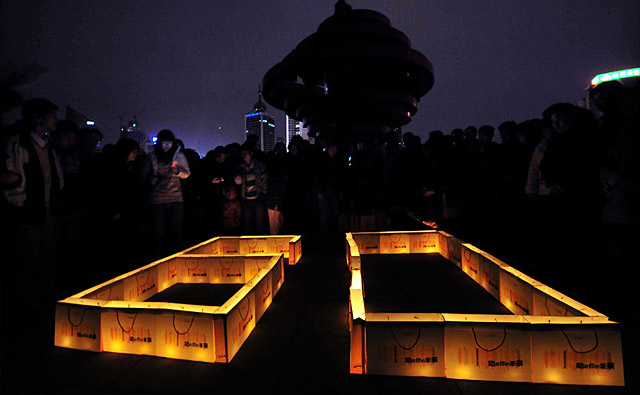 中國(guó)青島:3月28日,市民在青島五四廣場(chǎng)上擺出一小時(shí)“60”分鐘的造型參加“地球一小時(shí)”活動(dòng)。
