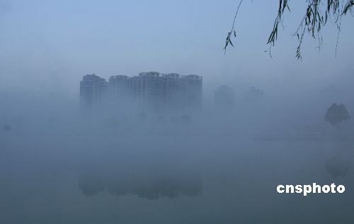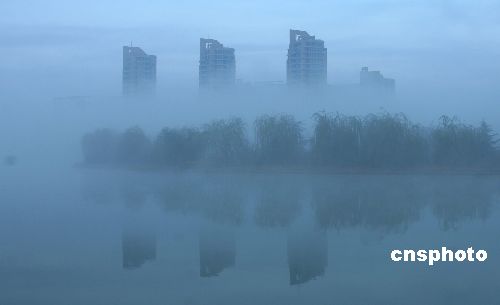 11月23日,進入“小雪”節氣,浙江省天臺縣冬霧彌漫,城市的樹木、房屋籠罩在濃霧中,虛幻宛若海市蜃樓。中新社發 丁必裕 攝