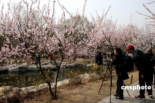 3月20日,北京植物園桃花盛開迎春爭艷,吸引了不少游客。中新社發 李遠志 攝