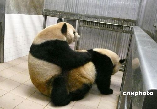 5月4日,成都大熊貓繁育研究基地提供的消息稱,4月27日下午至28日上午9時,日本和歌山白浜野生動物園雌性大熊貓“良浜”與雄性大熊貓“永明”先后三次自然交配成功,令中日大熊貓專家備感欣喜。旅日大熊貓“梅梅”之女“良浜”,也成為中國與國外開展大熊貓長期國際繁育合作計劃以來,首只在海外婚配成功的第二代大熊貓。中新社發 王基山 攝