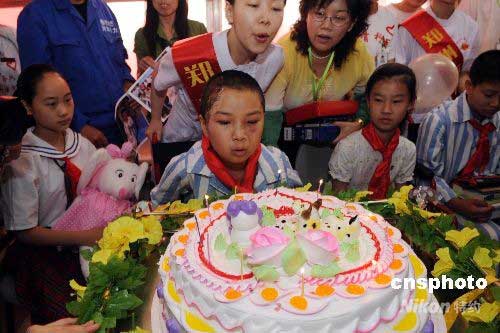 5月29日,來自四川青川縣喬莊鎮(zhèn)的李新婷在鄭州骨科醫(yī)院病房內(nèi)過十一歲生日,醫(yī)護(hù)人員、熱心市民為這位來自四川災(zāi)區(qū)的小傷員送上了生日蛋糕、小書包等禮物。中新社發(fā) 李志全 攝