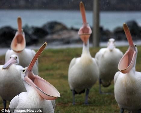 近日澳大利亞悉尼新南威爾士州普降小雨,這讓一群年幼的鵜鶘欣喜若狂,它們紛紛張口大嘴,享受雨水的“洗禮”。這一幕看起來(lái)非;路疬@些鵜鶘是為了將雨水存起來(lái)在沒(méi)雨的日子里使用一樣。