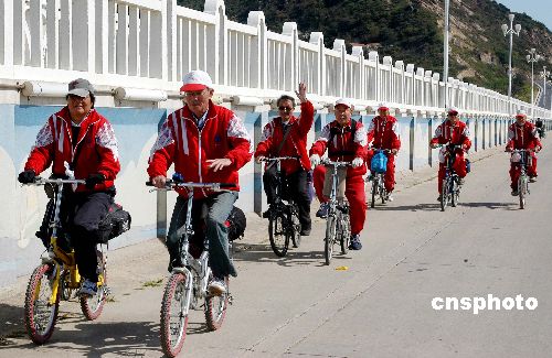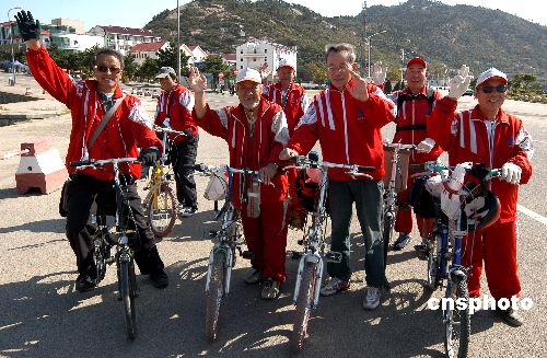 10月20日,由上海市老體協章向東等七位老人自發組成的“暢游蘇北迎奧運”自行車騎游隊來到連云港。他們10月18日從徐州騎自行車出發,終點為上海,途經連云港、淮安、揚州、泰州,計劃用15天時間到達目的地。騎游隊中年齡最大者80歲,最小的也70歲。老人們通過這種形式,既鍛煉身體暢游名勝,又是喜迎奧運的一次有意義的活動。中新社發 王春 攝