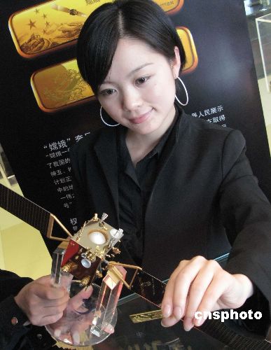“嫦娥一號”成功發(fā)射揭開了中國探月工程的序幕。為紀念這一成就,10月25日,“中國國家博物館藝術品開發(fā)中心監(jiān)制的“嫦娥一號”紀念金條在北京由國道黃金公司宣告發(fā)行。“嫦娥一號”紀念金條一套兩根,各為25克AU9999黃金,計限量發(fā)行2007套。第一根金條精雕象征中國萬里長城、五星紅旗和“嫦娥一號”在太空飛行的姿態(tài);第二根金條雕刻有嫦娥奔月的傳統(tǒng)神話圖案,寓意國人千年的夢想開始變成現實。金條背面雕刻的是“嫦娥”一號在太空的運行圖。該紀念金條經專業(yè)黃金工藝大師構思設計完成。圖為公關員持金條在鍍金的“嫦娥一號”配送禮品前亮相。中新社發(fā) 鄒憲 攝