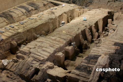 10月24日獲悉,已開放13年的西安兵馬俑二號坑陳列廳將于2007年11月1日起封館,對展廳屋頂漏雨情況進行全面處理。秦始皇兵馬俑二號坑總面積約8000平方米,是3個坑中最為壯觀的軍陣,目前,二號坑中發現的文物2000件,其中將軍俑、鞍馬俑、跪姿射俑為首次發現。二號坑陳列廳于1988年動工修建,1994年建成對外開放。此次修館是對二號坑屋頂進行翻修,將原屋頂揭掉重新建造屋頂。二號坑從11月1日起封閉,封館之后文物將陸續被轉移到文物展覽廳等地方。在文物搬離之后,為保證坑內還未發掘文物的安全,二號坑將全部回填、嚴密覆蓋。這一工程大約為期5個月,預計到2008年4月20日,二號坑屋頂將處理完畢,“五一”之前再向游客開放。中新社發 程千俊 攝