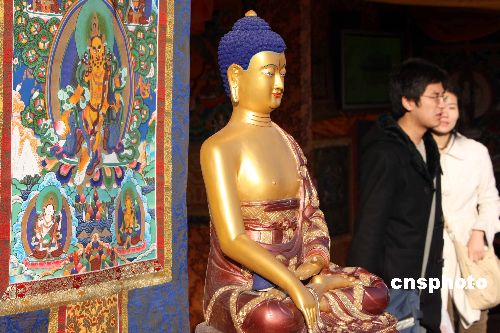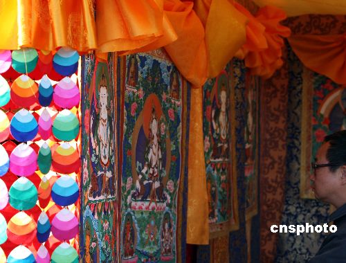 11月5日,中國青海熱貢藝術展會揭幕儀式在北京舉行。青海省黃南藏族自治州的“中國青海熱貢藝術展”本月2日首度亮相北京秋季書市后,神秘而璀璨的青海熱貢文化藝術瑰寶大放異彩,成為北京書市前所未有的一大亮點,為本屆書市帶來一股具有濃郁青海文化特色的異域之風,使京城市民有緣與這一中國首批非物質文化遺產零距離接觸。中新社發 任海霞 攝