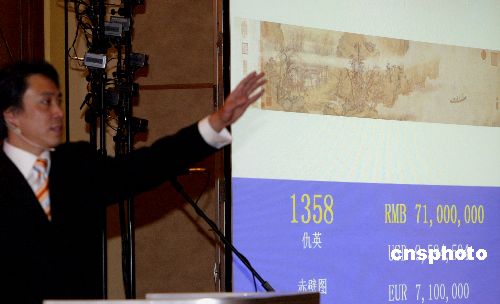 11月6日晚,中國(guó)嘉德2007秋季拍賣(mài)會(huì)的國(guó)寶級(jí)拍品明代仇英《赤壁圖》,最終以7952萬(wàn)元人民幣(含傭金)的天價(jià)成交,創(chuàng)下中國(guó)繪畫(huà)作品(包括所有中國(guó)書(shū)畫(huà)和油畫(huà)作品)拍賣(mài)的世界紀(jì)錄。據(jù)悉,該作品由中國(guó)內(nèi)地買(mǎi)家競(jìng)得。此幅作品受到藏家的極大關(guān)注,拍賣(mài)現(xiàn)場(chǎng)氣氛非常熱烈,拍賣(mài)師報(bào)出4000萬(wàn)元人民幣的起價(jià)后,隨即就有買(mǎi)家舉牌應(yīng)價(jià)。此后,現(xiàn)場(chǎng)買(mǎi)家與委托席叫價(jià)此起彼伏,競(jìng)價(jià)不斷飆升,爭(zhēng)奪趨于白熱化,最終以7100萬(wàn)元人民幣的價(jià)格落槌。中新社發(fā) 張煒 攝