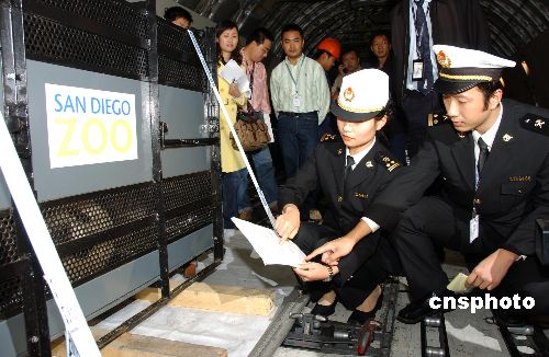 第一只在國外自然交配出生的大熊貓“美生”11月6日晚由美國飛抵上海浦東機場。“美生”到達后,即被送往上海野生動物園。這是上海海關第一次監管過境的大熊貓,所以海關人員一直陪伴在“美生”身邊。11月7日,“美生”將回到其父母的出生地——四川臥龍定居。中新社發 殷琮 攝