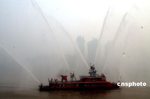 11月8日,重慶市水警總隊和重慶市水上消防支隊聯合舉辦“生命至上、平安和諧”大型消防安全宣傳活動,旨在進一步喚起當地民眾參與消防工作的熱情,增強民眾對消防工作的參與度。圖為重慶水上消防戰斗艇進行射水表演。中新社發 郭晉嘉 攝