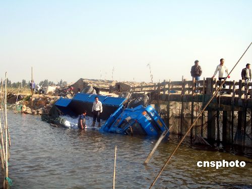 11月7日早晨5時許,一輛大貨車行駛至浙江溫嶺箬橫鎮西浦村新塘橋時,壓斷小橋后貨、車和人一起翻入河里,幸好河水不深,駕駛室內3人從車窗爬出逃生。據了解,此橋是該市十幾年前修筑東浦海塘時,為方便小型載貨車運送石料而修筑,多年來該橋只能承受小貨車同行,且橋面已有多處開裂。據悉,肇事車輛車身重8000公斤,加上載貨5000多公斤,共計13000公斤。中新社發 林貽高 攝