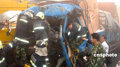 11月8日7時(shí)27分許,由于大霧,汾灌高速連云港浦南段發(fā)生三輛大貨車追尾相撞事故,造成二死二傷,傷者被成功救出后,已送往醫(yī)院搶救。中新社發(fā) 王春 攝