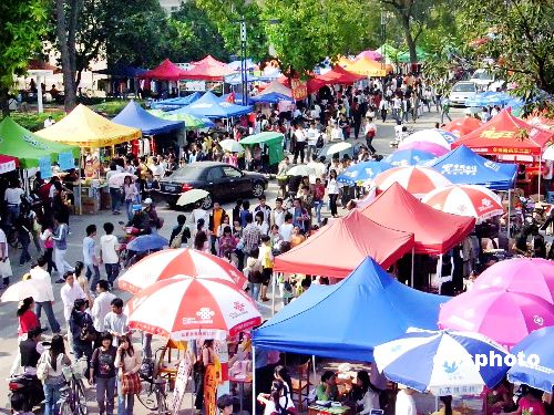 2007年11月9-10日,廣西大學一年一度的校園運動會舉行。每年的運動會期間,學生們都主動到社會拉商家贊助,只要商家贊助,學校就允許商家在運動會現場周邊擺攤經營。今年商家的進入達到高峰,校園主干道密密麻麻地擺滿了小攤,人頭涌動,車水馬龍,整個校園就像一個露天大超市。中新社發 駱文剛 攝