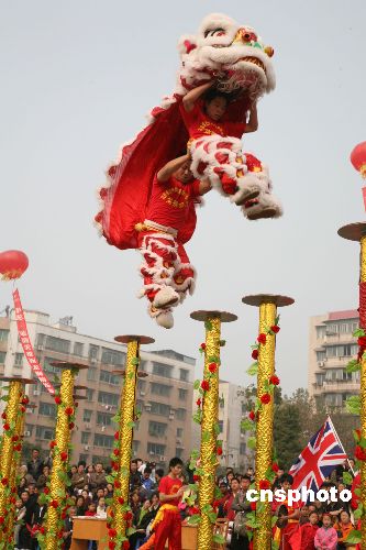 英國榮山中學(xué)·普利斯特伯利學(xué)校龍獅會在最高達(dá)三米的二十余根樁上進(jìn)行表演。