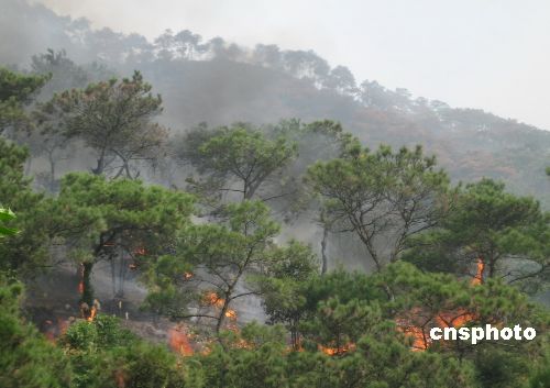 十一月十一日零晨廣東鼎湖富廊村的北嶺山林場布基工區發生山火,到十二日記者發稿時止,總過火面積約四千畝,現場東線桃園工區火勢得到較好控制,但山火仍在全力撲救中,當地已調集二千五百人次撲救,并出動兩架直升飛機從空中灑水彈滅火,暫未收到人員傷亡的報告。中新社發 黃耀輝 攝