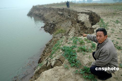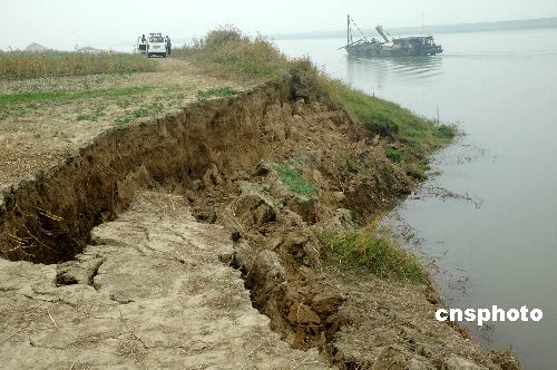 11月13日,受非法采砂影響,淮河淮南黑張段近千米河灘地出現坍塌,許多河灘地出現裂縫,隨時都可能坍塌,河灘地與淮南大堤的距離在逐漸縮短,一旦汛期來臨,將對防汛工作構成威脅。為此,水利部門建議,打擊處理非法采砂行為,海事部門要加強對“三無”采砂船的整治,沿淮各區、鎮政府也要聯動,對采砂船實行屬地管理,這樣才能有效打擊處理非法采砂行為。中新社發 柳青青 攝