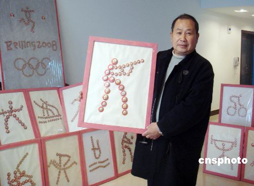 11月20日,62歲重慶市市民黃均德展示他用1860枚毛澤東像章拼成的一整套奧運標志圖案。圖標包括35個奧運運動項目和一個五環標志,共計36幅。中新社發 李林峰 攝
