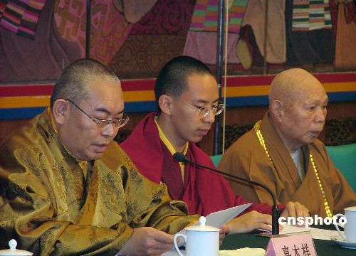 中國藏語系高級佛學院建院二十周年慶祝大會二十二日在北京人民大會堂西藏廳舉行,第十一世班禪額爾德尼·確吉杰布(中)出席慶祝大會。中新社發(fā) 徐長安 攝