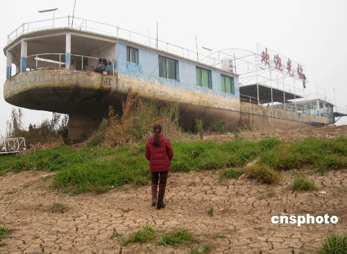12月10日清晨,湖南境內湘江流域長沙段面臨最低枯水位,游船高高擱淺在干涸的河床上。2007年汛期之后,湖南省降雨持續偏少,旱情迅速發展,已持續兩個多月,湘江水位持續走低,部分江段出現歷史記載以來的最低水位。據統計,目前湖南全省因旱造成4500多個村民組8.3萬多人及4萬多頭大牲畜飲水困難。中新社發 劉雙雙 攝