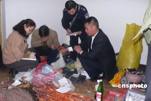 十二月九日下午,廣西柳州四名市民服用了街頭游醫的藥酒后中毒住進醫院,其中一人死亡,一人還在搶救中未脫險,另兩人經搶救脫離生命危險。柳州警方經過連續六個小時的偵查,分別在柳州和來賓抓獲街頭售藥的兩名“夫妻游醫”,并在他們的出租屋內查獲大量草藥。中新社發 秦付林 攝