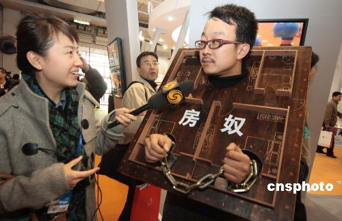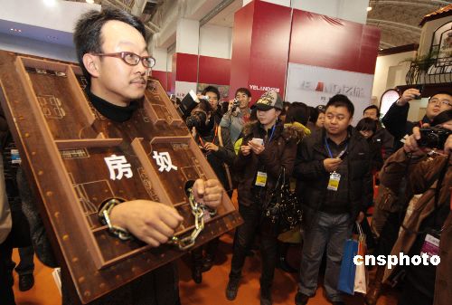 2007年12月11日,第九屆中國住交會在北京開幕。行為藝術(shù)家梁克剛的頭和雙手被“房奴”的鐐銬緊緊鎖住,他頻頻到各大房地產(chǎn)開發(fā)商的展臺“抗議”,表達自己的行為藝術(shù)。當行為藝術(shù)結(jié)束,打開“房奴”鐐銬后,該行為藝術(shù)家終于露出笑容。中新社發(fā) 吳芒子 攝