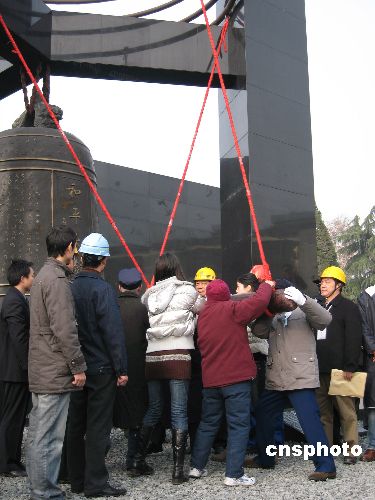 圖:南京大屠殺幸存者等和平人士撞響“和平大鐘”