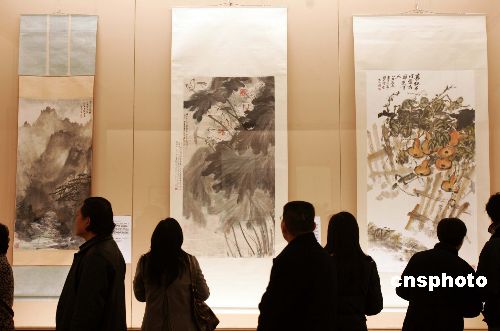 十二月十四日,中國畫壇三大巨匠張大千、劉海粟、朱屺瞻的作品在上海《虹口緣》書畫藝術邀請展上同時亮相,吸引觀眾。三位大師都曾在上海虹口區生活過。與虹口區結緣的還包括魯迅、蔡元培、沈尹默、 豐子愷、李叔同等,這些文人墨客的百件重要真跡也同時展出。中新社發 潘索菲 攝