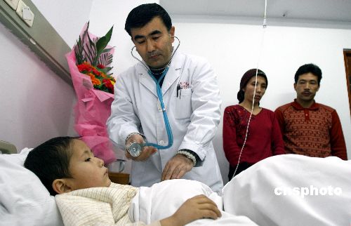 十二月十七日,新疆醫科大學第一附屬醫院心臟外科的醫生,正在為剛剛做完“心臟室間隔缺損修補術”的五歲維吾爾族小患者木尼爾丁進行常規術后檢查。據介紹,木尼爾丁來自新疆沙雅縣,患有先天性心臟病,由于家庭經濟困難,一直未能手術治療。本月中旬,木尼爾丁在新疆醫科大學第一附屬醫院進行了“心臟室間隔缺損修補術”,目前病情恢復情況良好。