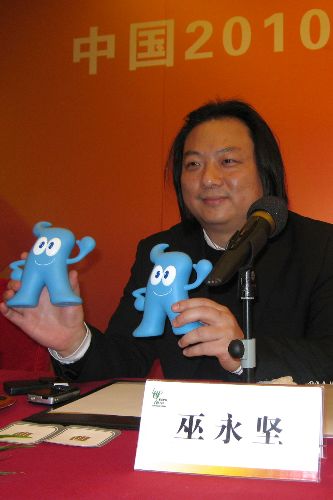 十二月十九日凌晨,臺灣設計師巫永堅亮相中國二0一0年上海世博會吉祥物揭曉新聞發(fā)布會,受到兩岸媒體追捧。巫永堅和他的團隊是上海世博會吉祥物“海寶”采用漢字造型的理念原創(chuàng)者,其最初設計的卡通漢字“大寶”形象,在全球兩萬六千余件應征作品中脫穎而出,巫永堅被媒體譽為“海寶的爸爸”。上海世博會最終揭曉的吉祥物“海寶”形象,經(jīng)由“海派”設計名家邵隆圖及其團隊的再創(chuàng)作,兩岸攜手使“大寶”定格為“海寶”。中新社發(fā) 裔蕊華 攝