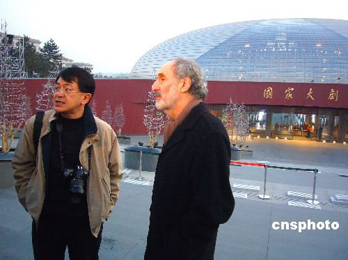 12月20日傍晚,國家大劇院主設計師安德魯出現在大劇院廣場前。據悉,安德魯將于12月22日出席國家大劇院首個演出季開幕盛典。背景資料:1998年4月,法國人保羅·安德魯參加了中國國家大劇院的設計競賽,經過兩輪競賽三次修改,歷時1年4個月,他的“巨蛋”方案從10個國家、36個設計單位的69個方案中拔得頭籌,1999年7月獲選為最終的建設方案。中新社發 玉龍 攝